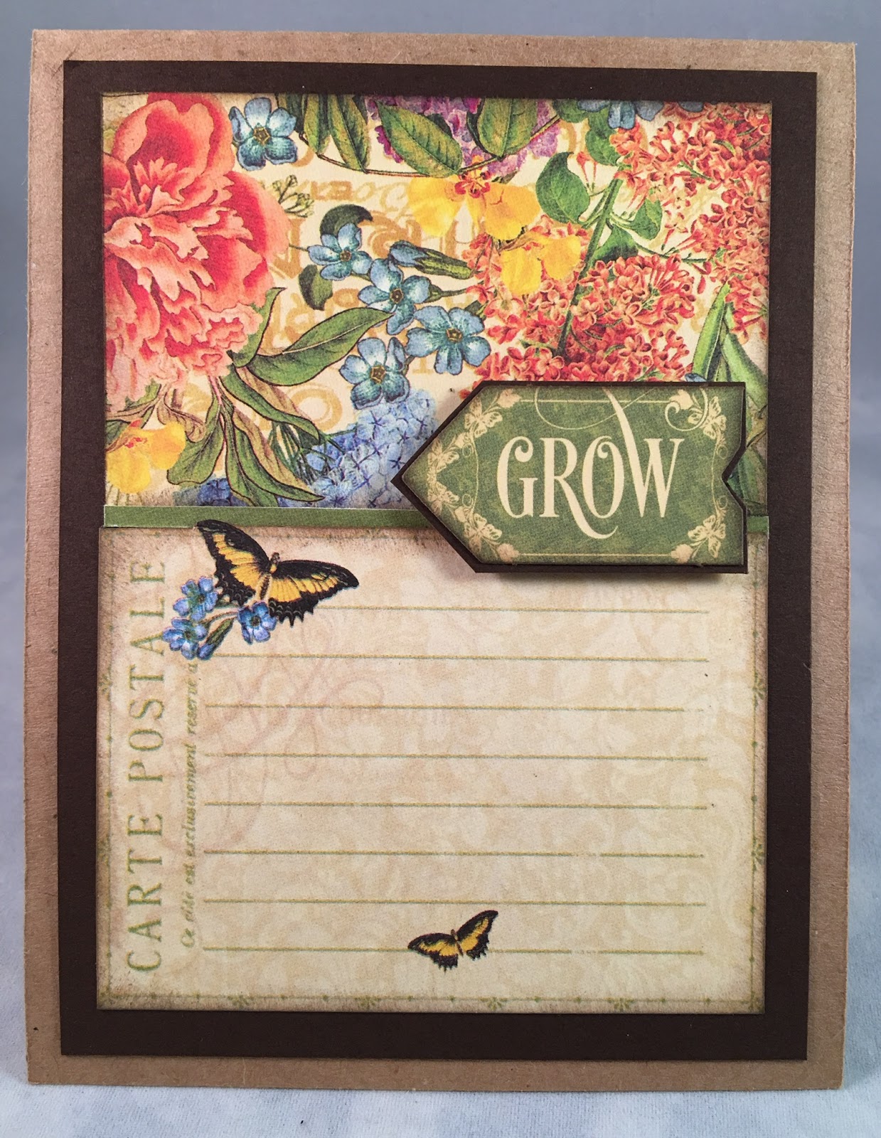 The sentiment is a sticker matted on brown eyes paper - "Life Began in a Garden". The sentiment is flanked by copper mini brads.
